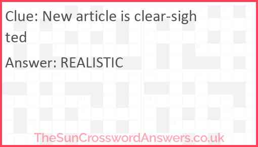 New article is clear-sighted is a crossword clue for which we have 1 possible answer and we have spotted 2 times in our database. This crossword clue was last seen on 11 July 2024 in The Sun Cryptic Crossword puzzle!