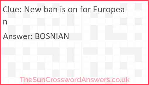 New ban is on for European is a crossword clue for which we have 1 possible answer and we have spotted 1 times in our database. This crossword clue was last seen on 17 June 2024 in The Sun Cryptic Crossword puzzle!