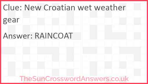 New Croatian wet weather gear is a crossword clue for which we have 1 possible answer and we have spotted 1 times in our database. This crossword clue was last seen on 13 October 2021 in The Sun Cryptic Crossword puzzle!