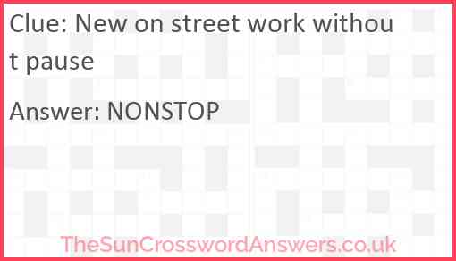 New on street work without pause is a crossword clue for which we have 1 possible answer and we have spotted 2 times in our database. This crossword clue was last seen on 22 August 2021 in The Sun Cryptic Crossword puzzle!