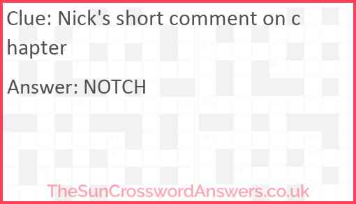 Nick's short comment on chapter is a crossword clue for which we have 1 possible answer and we have spotted 1 times in our database. This crossword clue was last seen on 04 April 2024 in The Sun Cryptic Crossword puzzle!
