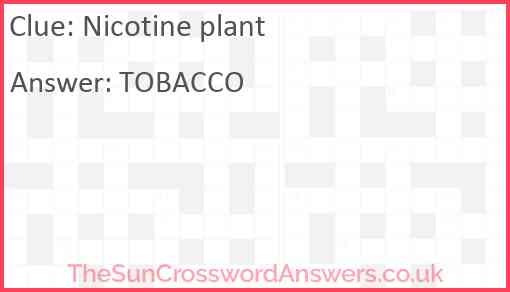 Nicotine plant is a crossword clue for which we have 1 possible answer and we have spotted 2 times in our database. This crossword clue was last seen on 22 December 2021 in The Sun Coffee Time Crossword puzzle!