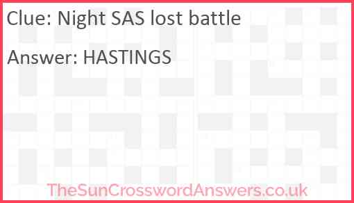 Night SAS lost battle is a crossword clue for which we have 1 possible answer and we have spotted 3 times in our database. This crossword clue was last seen on 30 June 2024 in The Sun Cryptic Crossword puzzle!