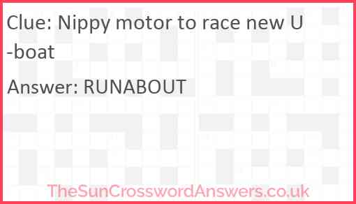 Nippy motor to race new U-boat is a crossword clue for which we have 1 possible answer and we have spotted 2 times in our database. This crossword clue was last seen on 26 August 2023 in The Sun Cryptic Crossword puzzle!