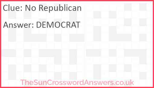 No Republican is a crossword clue for which we have 1 possible answer and we have spotted 3 times in our database. This crossword clue was last seen on 04 March 2022 in The Sun Coffee Time Crossword puzzle!
