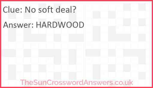 No soft deal? is a crossword clue for which we have 1 possible answer and we have spotted 3 times in our database. This crossword clue was last seen on 11 March 2023 in The Sun Cryptic Crossword puzzle!