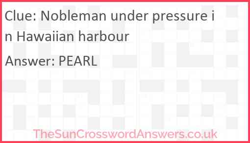 Nobleman under pressure in Hawaiian harbour is a crossword clue for which we have 1 possible answer and we have spotted 1 times in our database. This crossword clue was last seen on 07 March 2024 in The Sun Cryptic Crossword puzzle!
