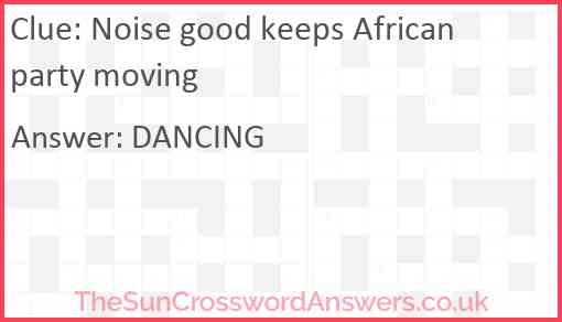Noise good keeps African party moving is a crossword clue for which we have 1 possible answer and we have spotted 1 times in our database. This crossword clue was last seen on 25 June 2023 in The Sun Cryptic Crossword puzzle!