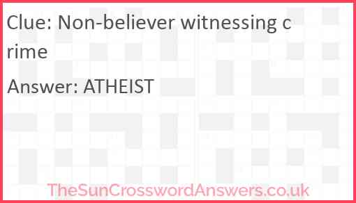 Non-believer witnessing crime is a crossword clue for which we have 1 possible answer and we have spotted 1 times in our database. This crossword clue was last seen on 27 May 2020 in The Sun Cryptic Crossword puzzle!