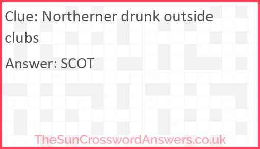 Northerner drunk outside clubs is a crossword clue for which we have 1 possible answer and we have spotted 3 times in our database. This crossword clue was last seen on 09 January 2023 in The Sun Cryptic Crossword puzzle!