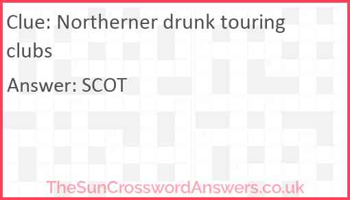 Northerner drunk touring clubs is a crossword clue for which we have 1 possible answer and we have spotted 1 times in our database. This crossword clue was last seen on 13 February 2019 in The Sun Cryptic Crossword puzzle!
