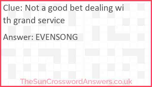 Not a good bet dealing with grand service is a crossword clue for which we have 1 possible answer and we have spotted 1 times in our database. This crossword clue was last seen on 30 October 2024 in The Sun Cryptic Crossword puzzle!