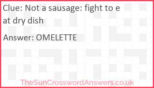 Not a sausage: fight to eat dry dish is a crossword clue for which we have 1 possible answer and we have spotted 1 times in our database. This crossword clue was last seen on 22 September 2023 in The Sun Cryptic Crossword puzzle!