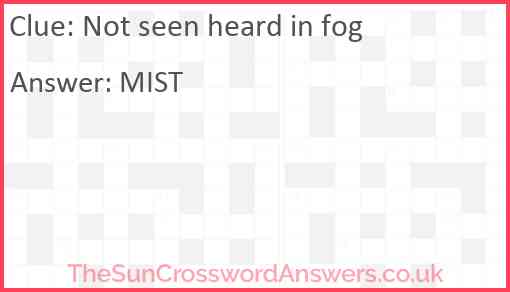 Not seen heard in fog is a crossword clue for which we have 1 possible answer and we have spotted 1 times in our database. This crossword clue was last seen on 27 November 2022 in The Sun Cryptic Crossword puzzle!