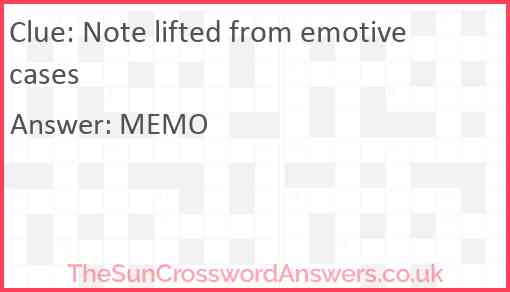 Note lifted from emotive cases is a crossword clue for which we have 1 possible answer and we have spotted 1 times in our database. This crossword clue was last seen on 31 December 2023 in The Sun Cryptic Crossword puzzle!