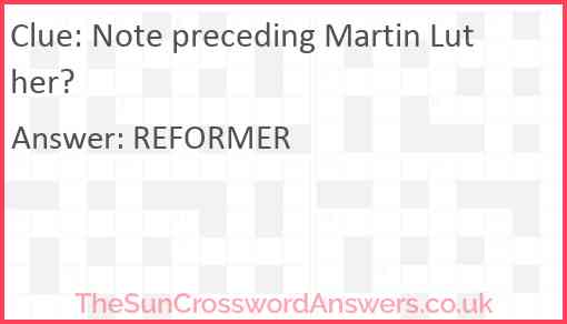 Note preceding Martin Luther? is a crossword clue for which we have 1 possible answer and we have spotted 2 times in our database. This crossword clue was last seen on 22 December 2024 in The Sun Cryptic Crossword puzzle!