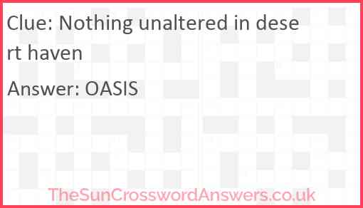 Nothing unaltered in desert haven is a crossword clue for which we have 1 possible answer and we have spotted 2 times in our database. This crossword clue was last seen on 03 July 2024 in The Sun Cryptic Crossword puzzle!