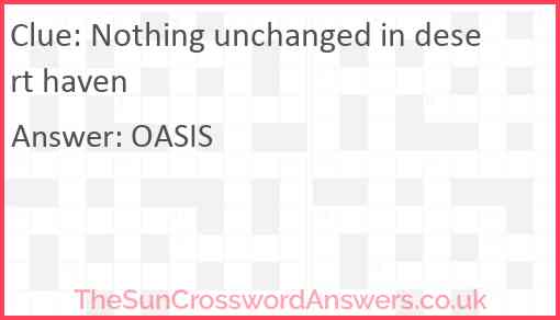 Nothing unchanged in desert haven is a crossword clue for which we have 1 possible answer and we have spotted 3 times in our database. This crossword clue was last seen on 12 September 2023 in The Sun Cryptic Crossword puzzle!