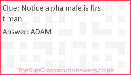 Notice alpha male is first man is a crossword clue for which we have 1 possible answer and we have spotted 4 times in our database. This crossword clue was last seen on 18 September 2022 in The Sun Cryptic Crossword puzzle!