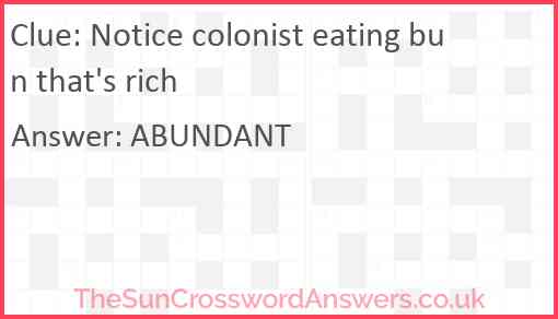 Notice colonist eating bun that's rich is a crossword clue for which we have 1 possible answer and we have spotted 4 times in our database. This crossword clue was last seen on 11 December 2022 in The Sun Cryptic Crossword puzzle!