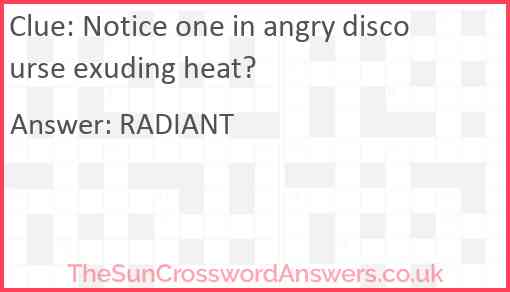 Notice one in angry discourse exuding heat? is a crossword clue for which we have 1 possible answer and we have spotted 1 times in our database. This crossword clue was last seen on 05 December 2022 in The Sun Cryptic Crossword puzzle!