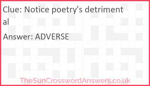 Notice poetry's detrimental is a crossword clue for which we have 1 possible answer and we have spotted 2 times in our database. This crossword clue was last seen on 10 June 2022 in The Sun Cryptic Crossword puzzle!
