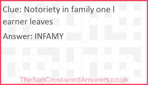Notoriety in family one learner leaves is a crossword clue for which we have 1 possible answer and we have spotted 2 times in our database. This crossword clue was last seen on 25 August 2023 in The Sun Cryptic Crossword puzzle!