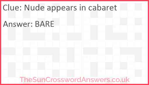 Nude appears in cabaret is a crossword clue for which we have 1 possible answer and we have spotted 4 times in our database. This crossword clue was last seen on 11 October 2024 in The Sun Cryptic Crossword puzzle!