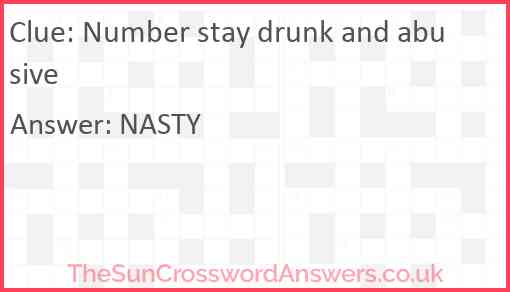 Number stay drunk and abusive is a crossword clue for which we have 1 possible answer and we have spotted 4 times in our database. This crossword clue was last seen on 19 September 2022 in The Sun Cryptic Crossword puzzle!
