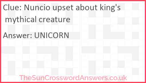 Nuncio upset about king's mythical creature is a crossword clue for which we have 1 possible answer and we have spotted 3 times in our database. This crossword clue was last seen on 09 March 2023 in The Sun Cryptic Crossword puzzle!