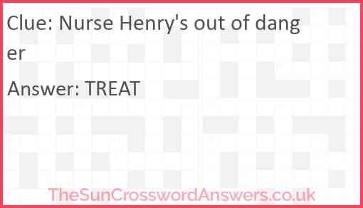 Nurse Henry's out of danger is a crossword clue for which we have 1 possible answer and we have spotted 1 times in our database. This crossword clue was last seen on 27 January 2025 in The Sun Cryptic Crossword puzzle!
