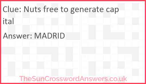 Nuts free to generate capital is a crossword clue for which we have 1 possible answer and we have spotted 1 times in our database. This crossword clue was last seen on 15 July 2024 in The Sun Cryptic Crossword puzzle!