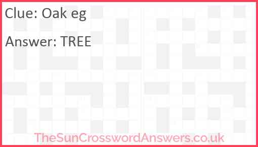 Oak eg is a crossword clue for which we have 1 possible answer and we have spotted 1 times in our database. This crossword clue was last seen on 24 December 2018 in The Sun Coffee Time Crossword puzzle!