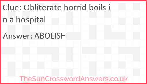 Obliterate horrid boils in a hospital is a crossword clue for which we have 1 possible answer and we have spotted 1 times in our database. This crossword clue was last seen on 06 June 2024 in The Sun Cryptic Crossword puzzle!