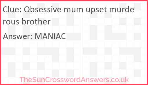 Obsessive mum upset murderous brother is a crossword clue for which we have 1 possible answer and we have spotted 2 times in our database. This crossword clue was last seen on 14 December 2023 in The Sun Cryptic Crossword puzzle!