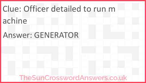 Officer detailed to run machine is a crossword clue for which we have 1 possible answer and we have spotted 5 times in our database. This crossword clue was last seen on 02 May 2024 in The Sun Cryptic Crossword puzzle!