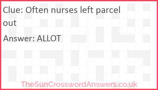 Often nurses left parcel out is a crossword clue for which we have 1 possible answer and we have spotted 2 times in our database. This crossword clue was last seen on 13 July 2024 in The Sun Cryptic Crossword puzzle!