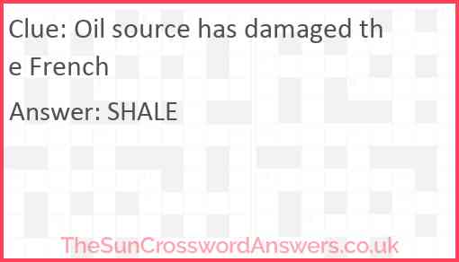 Oil source has damaged the French is a crossword clue for which we have 1 possible answer and we have spotted 2 times in our database. This crossword clue was last seen on 09 September 2024 in The Sun Cryptic Crossword puzzle!