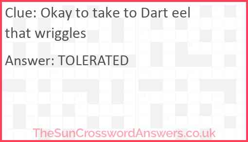 Okay to take to Dart eel that wriggles is a crossword clue for which we have 1 possible answer and we have spotted 1 times in our database. This crossword clue was last seen on 03 July 2024 in The Sun Cryptic Crossword puzzle!