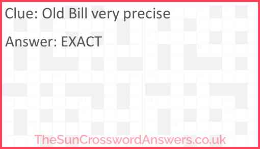 Old Bill very precise is a crossword clue for which we have 1 possible answer and we have spotted 4 times in our database. This crossword clue was last seen on 03 March 2025 in The Sun Cryptic Crossword puzzle!