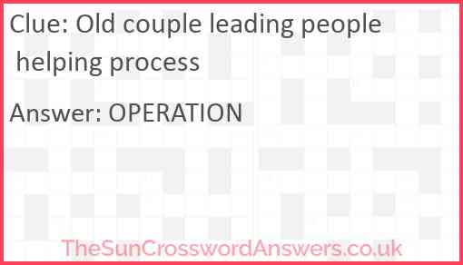 Old couple leading people helping process is a crossword clue for which we have 1 possible answer and we have spotted 2 times in our database. This crossword clue was last seen on 18 October 2023 in The Sun Cryptic Crossword puzzle!