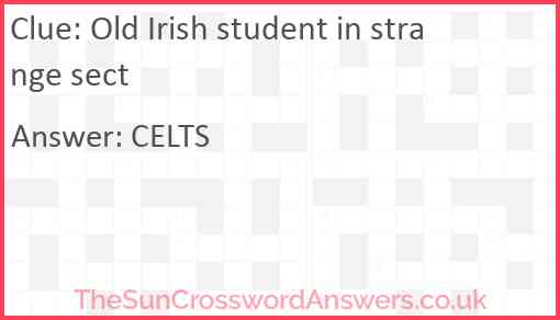 Old Irish student in strange sect is a crossword clue for which we have 1 possible answer and we have spotted 2 times in our database. This crossword clue was last seen on 18 July 2023 in The Sun Cryptic Crossword puzzle!