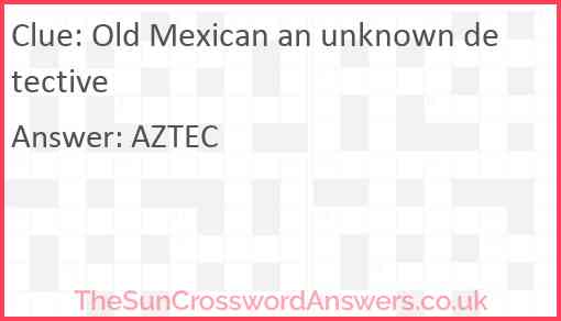 Old Mexican an unknown detective is a crossword clue for which we have 1 possible answer and we have spotted 3 times in our database. This crossword clue was last seen on 05 December 2023 in The Sun Cryptic Crossword puzzle!