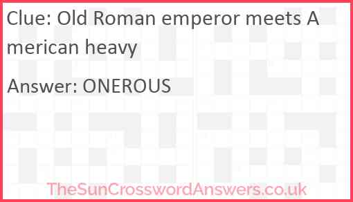 Old Roman emperor meets American heavy is a crossword clue for which we have 1 possible answer and we have spotted 2 times in our database. This crossword clue was last seen on 05 January 2025 in The Sun Cryptic Crossword puzzle!