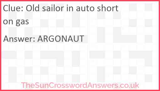Old sailor in auto short on gas is a crossword clue for which we have 1 possible answer and we have spotted 2 times in our database. This crossword clue was last seen on 16 July 2024 in The Sun Cryptic Crossword puzzle!