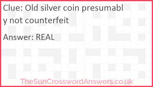 Old silver coin presumably not counterfeit! is a crossword clue for which we have 1 possible answer and we have spotted 3 times in our database. This crossword clue was last seen on 29 July 2022 in The Sun Cryptic Crossword puzzle!
