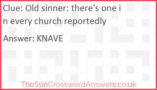 Old sinner: there's one in every church reportedly is a crossword clue for which we have 1 possible answer and we have spotted 2 times in our database. This crossword clue was last seen on 25 April 2024 in The Sun Cryptic Crossword puzzle!