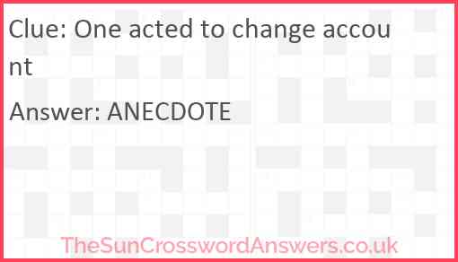One acted to change account is a crossword clue for which we have 1 possible answer and we have spotted 1 times in our database. This crossword clue was last seen on 10 July 2021 in The Sun Cryptic Crossword puzzle!