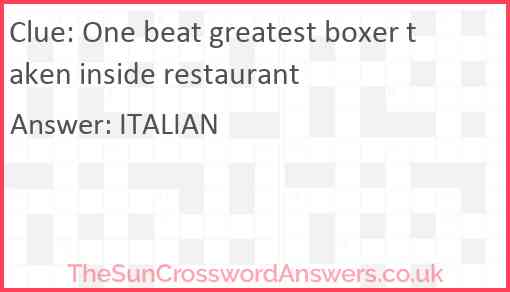 One beat greatest boxer taken inside restaurant is a crossword clue for which we have 1 possible answer and we have spotted 2 times in our database. This crossword clue was last seen on 08 February 2022 in The Sun Cryptic Crossword puzzle!
