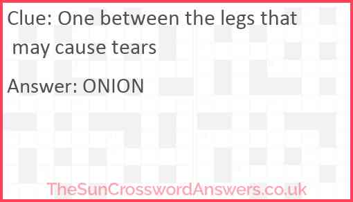One between the legs that may cause tears is a crossword clue for which we have 1 possible answer and we have spotted 1 times in our database. This crossword clue was last seen on 21 June 2019 in The Sun Cryptic Crossword puzzle!
